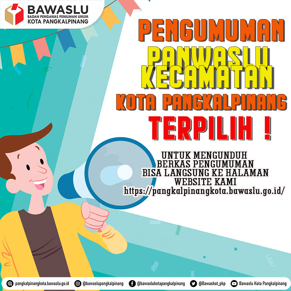 PENGUMUMAN ANGGOTA PANWASCAM TERPILIH humas | Rabu, Oktober 26, 2022 - 08:22 047-pengumuman-nama-nama-panwascam-terpilihDownload Tag Pengumuman Share Berita Terkini humas Jumat, Desember 5, 2025 - 19:44 Bawaslu Kota Pangkalpinang Genjot Penguatan Arsip dan Manajemen SDM, Siap Tingkatkan Kualitas Pengawasan Demokras humas Jumat, Desember 5, 2025 - 18:20 Bawaslu Kota Pangkalpinang Temukan Pemilih Ganda saat Pengawasan Coktas, Sampaikan Saran Perbaikan ke KPU Pangkalpinang. humas Kamis, Desember 4, 2025 - 14:55 Bawaslu Kota Pangkalpinang Gelar Rapat Evaluasi Penyelesaian Sengketa Proses pada Pemilihan Ulang Tahun 2025 Lihat Lainnya